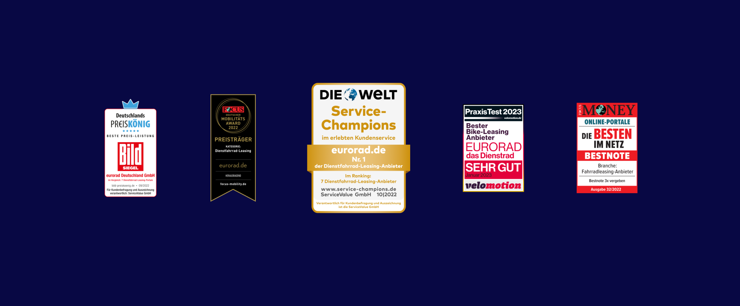 Auszeichnung für eurorad eurorad wurde von verschiedenen Testberichten als bester Bike-Leasing-Anbieter gekürt! Die Tageszeitung DIE WELT, das Magazin FOCUS MONEY mit dem Deutschland-Test und das Fahrrad-Magazin velomotion.de...